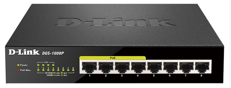 Коммутатор D-Link DGS-1008P с 8 портами 10/100/1000 (4 порта с поддержкой PoE + 4 порта без поддержки PoE)