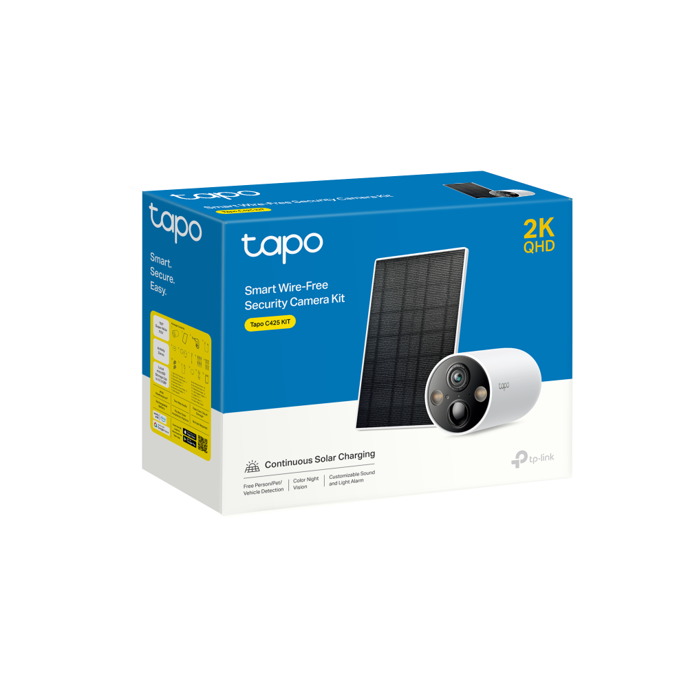 Комплект поставки | Камера Tapo C425 ×1, Сонячна панель Tapo A201 ×1, Кронштейни ×2, Подовжувальний дріт ×1, Декоративна накладка ×1, Монтажний шаблон, Анкери ×6, Гвинти ×6, Ущільнювачі ×2, Кабель для зарядки ×1, Кабельні стяжки ×1, Гвинтові кришки ×2, Посібник із швидкого старту |